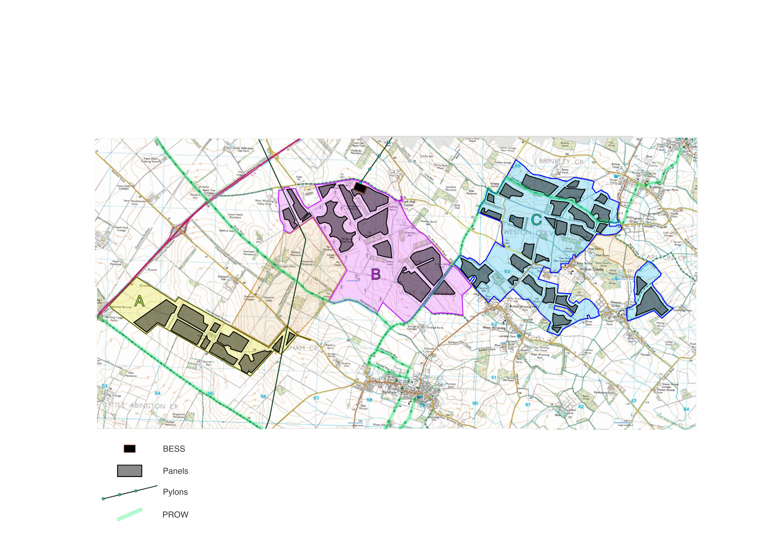 In this the grey areas show where the solar panels will actually be positioned. The black rectangle just West of the Larks Hall double bends is the compound for the battery energy storage system (BESS) containers, and the green line that leads off from there is t start of the 16 km of pylon cable that goes to Burwell. You can download a high resolution version of the OS map.